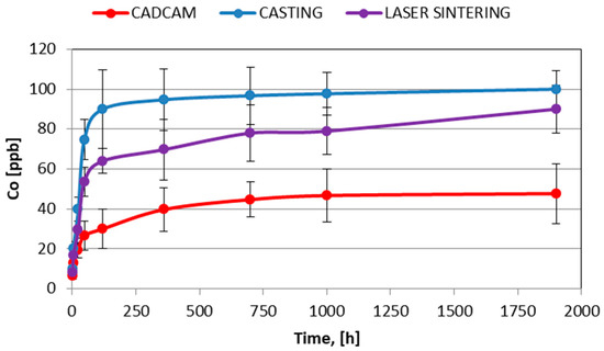 All samples showed total amounts of both released ions Co and Cr far below the ISO requirements [42,49,50,51,52,53,54]. In this respect, it is important to confirm that ion release and corrosion resistance are different aspects. Some researchers have suggested that low ion release rates were indicative of a good corrosion resistance. However, this affirmation cannot be generalized, given the existence of [55] metals with good corrosion resistance and high ion release rates. Corrosion is a chemical reaction whose products can be toxic, whereas ion release is a dissolution in the physiological medium. This aspect must be taken into account in order to avoid false conclusions.