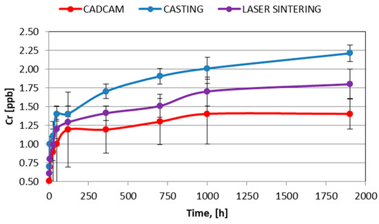 Cr ion release was lower than Co due to the stabilization of this element as Cr-oxide decreasing their release to the artificial saliva. It is well known that the natural surface oxide films formed on CoCr dental alloys protect the alloys from corrosion, acting as passive barrier films [47]. These oxide films are dense as well as homogeneously distributed over the surface, which are primarily composed of Cr2O3. However, stability and homogeneity of these films depends on the microstructure produced by manufacturing methods [48]. Excessive volume growth of the passive oxide-film may result in cracking and partial detachment, entailing a reduction in passivation capacity. The oxide is transparent, regenerative, and is reformed spontaneously [4,8]. As can be observed from the results presented in Figure 8, Cr release rates detected were very low, near the limit of sensitivity of the equipment. The results after 1900 h were close to 2 ppb.
