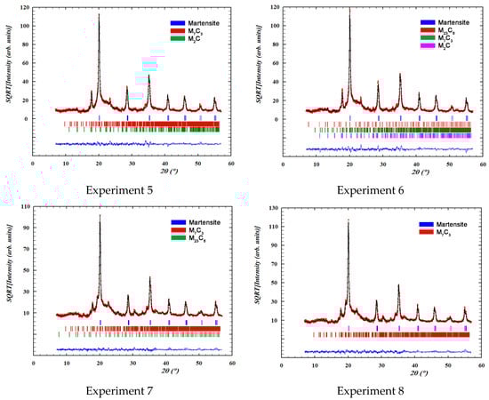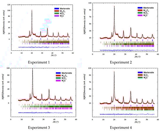 Figure 3 shows the overall fittings obtained by means of Rietveld structural refinement. The red marks indicate the observed intensities; the black line indicates the intensity calculated according to the Rietveld structural model; the blue line indicates the difference between the two; while the vertical segments indicate the angular positions of the different identified phases.