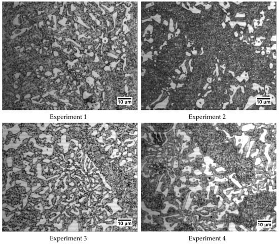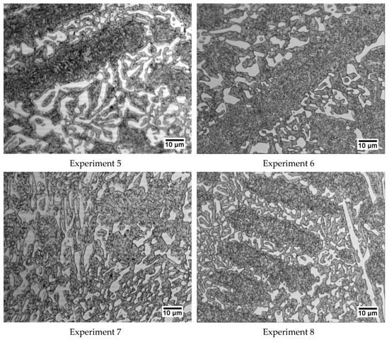 The effect of a factor is measured as the consequence of its variation on a certain microstructural feature of the material. This type of effect is called a main effect. The effect of one factor may possibly depend on the value that another takes. When this occurs, these factors are said to interact. The influence of the main effects is greater than that of the 2-factor interactions. In turn, the influence of the 2-factor interactions is greater than that of the 3-factor interactions, and so on successively. In practical terms, it is sufficient to consider only the main effects and the 2-factor interactions, which allows the number of experiments to be reduced []. In this study, the effect of 5 factors performing 8 experiments has been analysed. If the aim were to analyse all the possible interactions with these 5 factors, it would be necessary to perform 32 experiments (25 = 32). However, in this case, only 8 effects (25−2) have been estimated, which therefore means a 1/4 (32/4 = 8) fractional factorial design. Table 2 shows the array of experiments. Columns D and E have been respectively constructed from the product of columns A × B and A × C []. The “Confounding Pattern” column indicates only the main effects and those 2-factor interactions whose effects are confounded with the main effects.