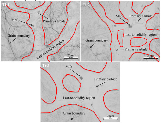(1) Primary carbides and MnS inclusions formed in the last-to-solidify region. As the Ti content increased, the size of the last-to-solidify region increased.