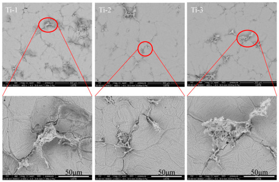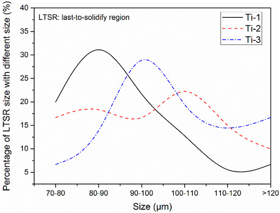 Figure 3 shows the variation of Ti content with the last-to-solidify region size. The size of the last-to-solidify region in the Ti-1 sample was mainly 80–90 μm. The size of the last-to-solidify region in the Ti-3 sample was mainly 90–100 μm. As the Ti content increased, the size of the last-to-solidify region gradually increased, especially the area with a size larger than 120 μm. According to the principles of nucleation and growth of new crystals during solidification, the size of the last-to-solidify region is that of the original austenite grain. The mechanism by which the Ti content influences the original austenite grain size needs to be further analyzed.