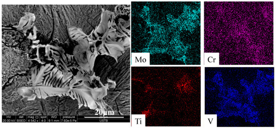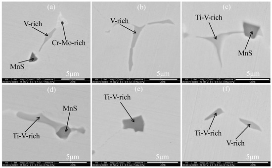 The samples contained the same types of inclusion, whose specific morphology and composition are shown in Figure 4. The typical inclusions were classified into four types: 1, V-rich carbide, shown by the gray area in Figure 4a,b,f; 2, Ti–V-rich carbide, shown in Figure 4c–f; 3, Cr–Mo-rich carbide, shown by the white area in Figure 4a; 4, MnS inclusion, shown by the black area in Figure 4a,c,d. The primary carbides, including the V-rich and the Ti–V-rich ones, appeared as strips, and their size was approximately 10 μm. The primary carbides were present either alone or in combination with MnS. After MnS, Ti–V-rich carbide, and V-rich carbide formed at the front of the solid–liquid interface, MnS and the primary carbides were pushed to the last-to-solidify region, as the crystal continued to grow, possibly causing the aggregation of MnS and primary carbides. Therefore, the primary carbides were present either alone or in combination with MnS.