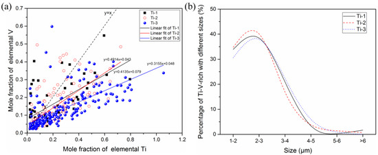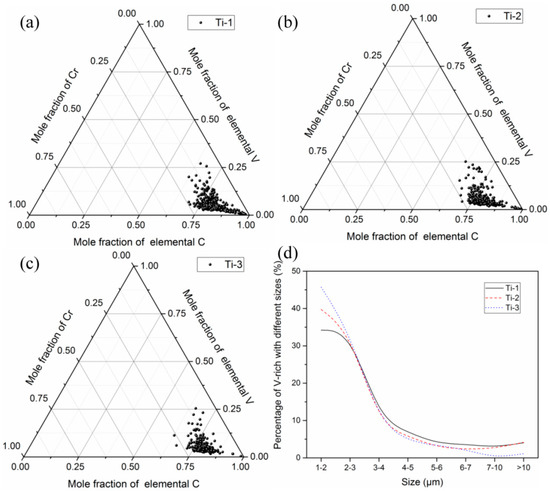 We obtained the composition of the Ti–V-rich carbide, especially for the Ti and V elements, and the results are shown in Figure 7a. The composition of the Ti–V-carbide carbide varied in different areas, so we performed a linear fit of the composition in different points. The slope of the Ti-1 and Ti-2 samples was not much different, while the slope of the Ti-3 sample was significantly lower than that of the Ti-1 and Ti-2 samples. Therefore, the mole fraction of elemental Ti in the Ti–V-rich carbide present in the Ti-3 sample was the highest. The reason for the varied composition in different points will be expounded in part 3.3. The size of the Ti–V-rich carbide inclusions in the samples as also mainly small (2–3 μm), and some coarse Ti–V-rich inclusions with a size larger than 6 μm were found. Changes in Ti content had a little effect on the size distribution of Ti–V-rich inclusions.