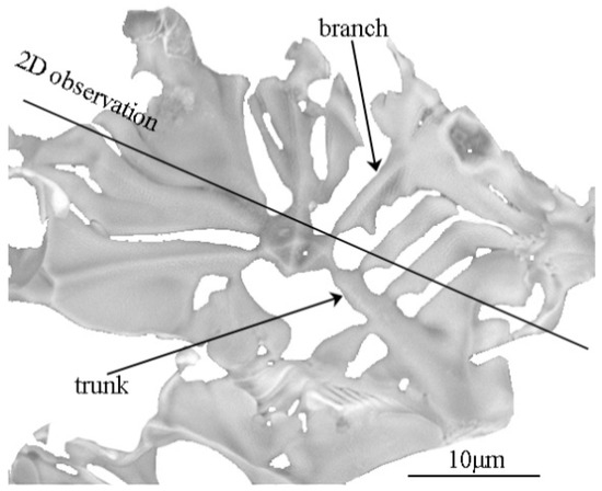 Figure 9 can clarify the confusing experimental results in Figure 7a and the limitations of the 2D observation. The Ti–V-rich, V-rich, and Cr–Mo-rich carbides observed in the 2D observation were just different portions of the dendritic primary carbide observed in the 3D observation; they were not three independent primary carbides. Therefore, the 2D observation significantly underestimated the size of the primary carbide and overestimated the number density of the primary carbide compared to the 3D observation, because only a part of the trunk and/or branch could be observed in the 2D analysis. The incorrect statistics of the primary carbide determined by the 2D observation, as shown in Figure 7b and Figure 8b, underestimated its harm to the performance of H13 steel. Since the area of the branches was much larger than that of the trunk, the statistical size of V-rich carbide was larger than that of the T–V-rich carbide according to the 2D observation, as shown in Figure 7b and Figure 8b. Because of the uneven distribution of the Ti element in the Ti–V-rich carbide and the uniform distribution of the V element in the V-rich carbide, the composition of Ti–V-rich carbides in different points varied, whereas the composition of V-rich carbides was uniform in the 2D observation, as shown in Figure 7a and Figure 8a–c. Therefore, only a 3D observation can truly determine the characteristics of the primary carbide in H13 ingots.