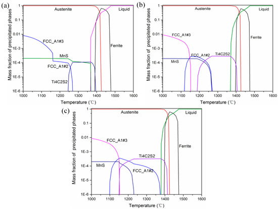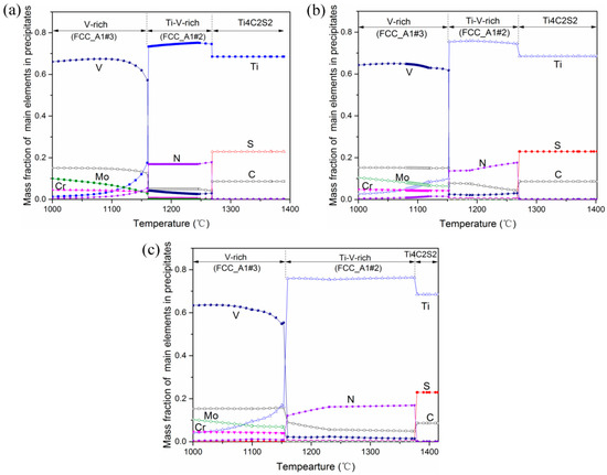 At the end stage of the solidification, the Ti4C2S2 phase formed first and then transferred into the FCC_A1#2 phases, which finally further transferred into the FCC_A1#3 phase. The variation of the mass fraction of the main elements in the primary carbides with the temperature is shown in Figure 14. The precipitation sequence of the primary carbides in the three samples was the same. The Ti4C2S2 phase enriched in elemental Ti, C, and S precipitated first. As the temperature decreased, the contents of the elemental Ti, C, and S remained basically stable. The formation reaction of the Ti4C2S2 phase is as follows.