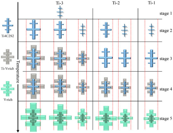According to the thermodynamic results in Figure 14 and the experimental results in Figure 10 and Figure 12, we could determine the specific formation process of primary carbides in the samples with different Ti contents, as shown in Figure 15. The left part of the Figure shows the decrease in temperature. The right part shows different temperature ranges. The red line reflects the changes in carbide size. As the temperature decreased (stage 1), the Ti4C2S2 phase precipitated first in the Ti-3 sample, but the precipitation conditions of the Ti4C2S2 phase were not reached in the Ti-1 and Ti-2 samples. When the temperature decreased to stage 2, the Ti4C2S2 phase in the Ti-1 sample just started to precipitate. The Ti4C2S2 phases in the Ti-3 and Ti-2 samples grew into a dendritic structure and precipitated again. Therefore, the number density and size of the primary carbide in the Ti-3 sample were the largest, followed by those of the Ti-2 sample. As the temperature continued to decrease (stage 3), the Ti–V-rich carbide in the Ti-3 sample started to precipitate, using the Ti4C2S2 phase as the nucleation core. For the Ti-1 and Ti-2 samples, only further growth of the Ti4C2S2 phases occurred during this process. When the temperature decreased to stage 4, the Ti–V-rich carbide in the Ti-3 sample grew gradually, and then the Ti4C2S2 phase started to transform into Ti–V-rich carbide. Therefore, the size of the Ti–V-rich carbide continued to increase, and the size of the Ti4C2S2 phase started to decrease. In stage 4, the Ti4C2S2 phases started to change into Ti–V-rich carbide in the Ti-1 and Ti-2 samples. Therefore, the size of the Ti4C2S2 phase in the Ti-1 and Ti-2 samples continued to decrease, and the sizes of the primary carbide remained basically the same. When the temperature decreased to stage 5, the Ti4C2S2 phase completely changed into the Ti–V-rich carbide in all samples, and the Ti–V-rich carbide started to change into V-rich carbide. Considering that the transformation temperature was relatively low at this time, the transformation could not be complete, so the small-sized Ti–V-rich carbides remained in the core of the primary carbide. Subsequently, the V-rich carbide started to precipitate around the periphery of the primary carbide, and the size of the primary carbide gradually increased. The three-dimensional features of the final primary carbides are shown in Figure 10 and Figure 12.