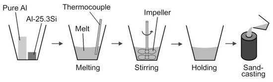 Figure 1 shows a schematic illustration of the casting process of a master alloy. High-purity aluminum ingots and Al-25.3 wt. % Si ingots (Table 1) were weighed and set together in a crucible so that the silicon content was 6.4 wt. %. The ingots were heated in an electronic furnace in air at 800 °C. The melt was stirred by rotating an impeller at 8.3 s−1 for 160 s. After stirring, the melt was left to stand for 480 s and was sand-cast in a mold (ϕ 30 mm × 315 mm in length). The cast material was used as the master alloy.
