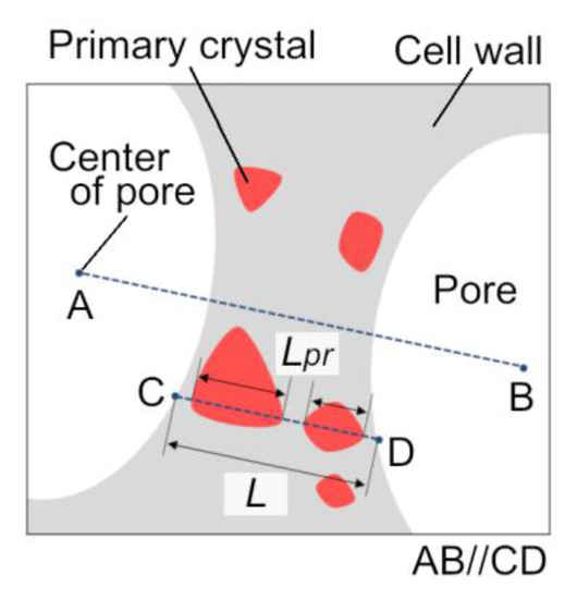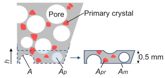 Each specimen from six cut parts mounted in resin was ground by waterproof abrasive papers, a diamond suspension with a satin polishing cloth, and colloidal silica with a suitable polishing cloth using a polishing machine (MECATECH 334, Presi, Tokyo, Japan). The colloidal silica included an etching agent. The polished surface was observed with an optical microscope (VHX-5000, Keyence, Miyagi, Japan). From the microscopic images, the grained crystals, which are approximately 200 μm in size, were defined as primary crystals and filled with red color. The area of each primary crystal Apr and the area of the metallic part Am were measured with WinROOFTM using the same process shown in the previous section. The area ratio of the primary crystals was calculated by dividing the sum of the area of the primary crystals ΣApr in the measurement window by the area of the master alloy Am, as shown in Figure 3. Each equivalent diameter of the primary crystal dpr was calculated by Equation (2), with the parameter Ap replaced by Apr. Furthermore, the length ratio of the primary crystals to the width of each cell wall, Pcw, was calculated by dividing the width of the cell wall L by the total length of the primary crystals Lpr as shown in Figure 4. The distributions of ΣApr/Am were plotted on a graph.