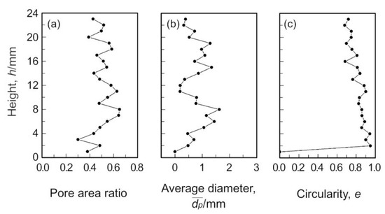 Each equivalent pore diameter dp was calculated with Equation (2), and the average equivalent pore diameter was calculated by dividing the sum of all the dp’s by the total number of pores in the measurement window.