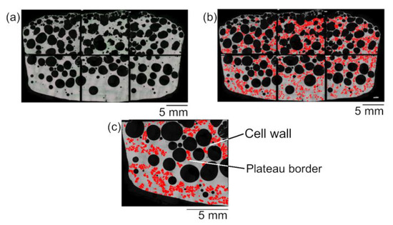 Microscopic images of cross section of the aluminum alloy foam. (a) Original images of six specimens, (b) processed image after filling primary crystals with red, and (c) the magnified view of the lower-left part in (b).