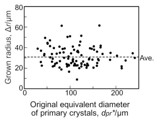 “Grown radius” Δr, which is the increment of radius during cooling, for each original equivalent diameter of primary crystal, dpr*. The dotted horizontal line indicates the average grown length