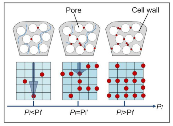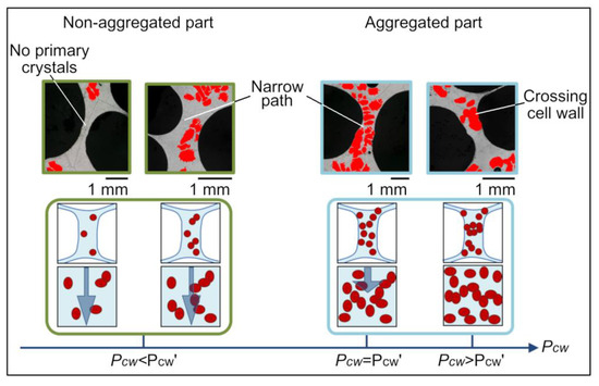 First, the following discussion about percolation theory applied to cell walls is summarized in Figure 11. From microscopic observation, the cell walls can be grouped into three categories: those crossed by primary crystals, those having a narrow path through primary crystals, and those without any primary crystals. The cell walls in the first category are apparently clogged by crossed primary crystals according to percolation theory. However, it is not clear if the cell walls in the second and the third category are clogged by the primary crystals. Therefore, the percolation model for a flow was applied to the cell walls [17]. In this model, the percolation probability of the cell wall model is Pcw, as indicated in Section 2.4. The percolation threshold of this model, Pcw′, is approximately 0.581. Kuwahara et al. reported that the critical solid fraction fs_cr, which is the area fraction of the primary crystals required for inhibiting the drainage, is in the range 20–45%, and the expression was established [14]. The values of Pcw at all cell walls were compared with Pcw′, and cell walls with Pcw larger than Pcw′ (Pcw > Pcw′) were recognized as the aggregated parts. On the other hand, cell walls with Pcw smaller than Pcw′ were recognized as the non-aggregated parts. According to percolation theory, the aggregated parts are kept stable owing to the inhabitation of drainage by the clogging effect of the primary crystals.