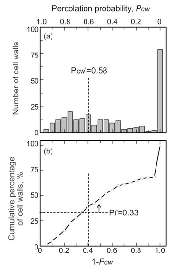 Distribution of cell walls. (a) Number of cell walls, and (b) cumulative percentage of cell walls plotted against the percolation probability Pcw.