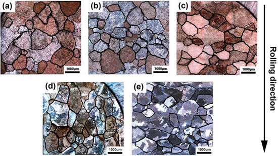 OM images of TC4F after treatment. Samples (a) 1, (b) 2, (c) 3, (d) 4 and (e) 5.