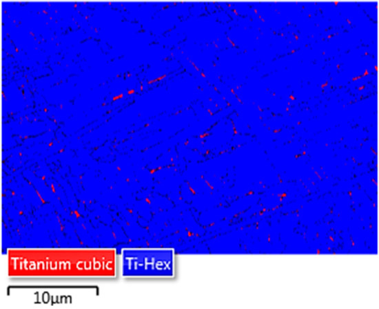Phase-indexing image of Sample 4 after heat treatment taken by electron backscatter diffraction (EBSD). Regions with hexagonal close-packed (HCP) Kikuchi diffraction pattern identified as α phase and represented in blue; those with body-centered cubic (BCC) pattern identified as β phase and represented in red.