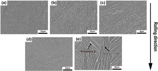 The microstructure was observed with an OM and a scanning electron microscope (SEM; Scios, FEI, Hillsboro, OR, USA). Samples examined with the OM were polished using standard metallographic techniques to obtain a mirrorlike surface, and then etched with HF:HNO3:H2O = 1:2:7. The prior-β size was obtained through OM observation. In addition to the above polishing procedures, the samples examined with the SEM were electrochemically polished and cleaned with alcohol. For the SEM and OM images, the size of prior-β grains, the phase fractions, and the size of the α and retained β phases were obtained using Image-Pro Plus software. The phase fraction and size of the phases were measured repeatedly in different areas and/or samples; thus, the values of the average phase fraction and the average size of the α phases were statistically significant.