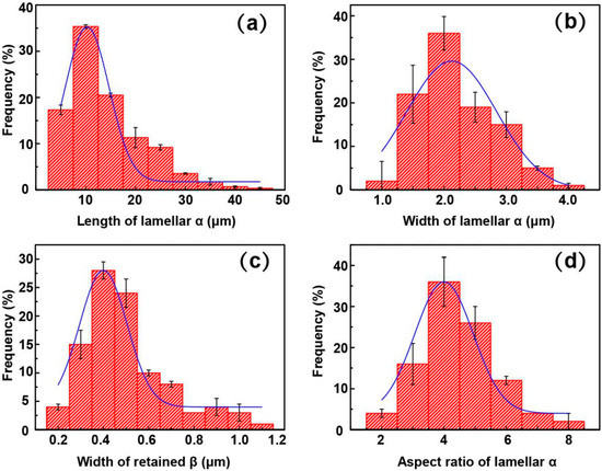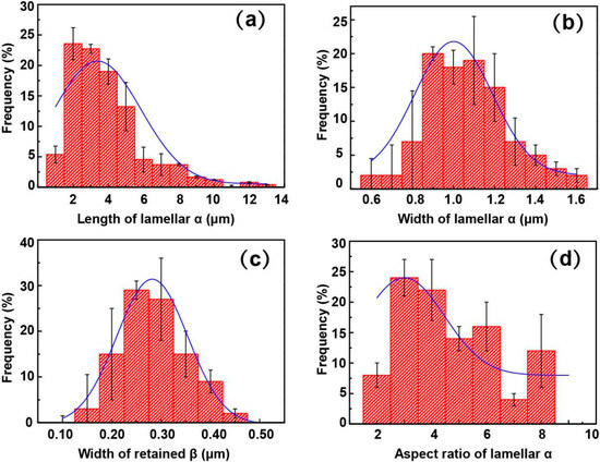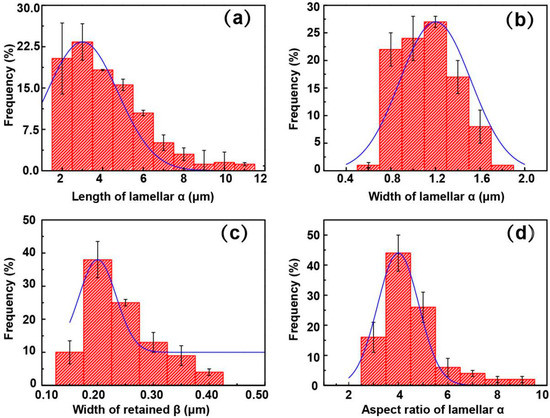 Distribution of microstructural features of TC4F Sample 5 after treatment. (a) Length of lamellar α, (b) width of lamellar α, (c) width of retained β, and (d) aspect-ratio distribution of lamellar α. Microstructural features followed Gaussian distribution. Most probable values of α length, width, aspect ratio, and retained β were ~10, ~2.0, ~4, and ~0.4 μm, respectively.