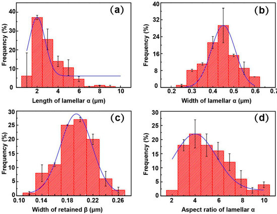Distribution of microstructural features of TC4F Sample 2 after treatment. (a) Length of lamellar α, (b) width of lamellar α, (c) width of retained β, and (d) aspect-ratio distribution of lamellar α. Microstructural features followed Gaussian distribution. Most probable values of α length, width, aspect ratio, and retained β were ~3, ~0.9, ~3, and ~0.25 μm, respectively.