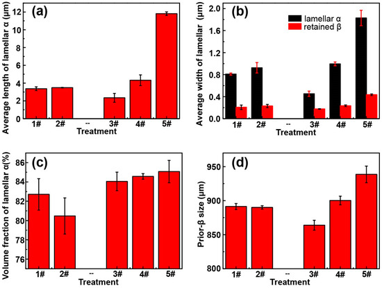 Statistical microstructural features of TC4F after heat treatments. (a) Average length of lamellar α, (b) average width of lamellar α and retained β, (c) volume fraction of lamellar α, and (d) average prior-β size.