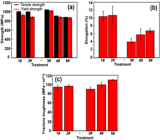 Mechanical properties of TC4F after heat treatments. (a) Strength, (b) elongation, and (c) fracture toughness.