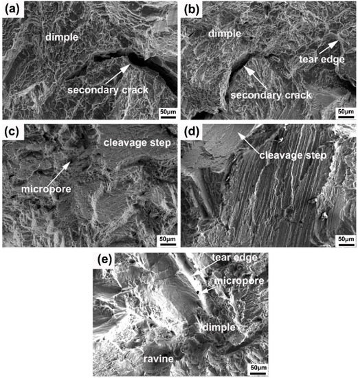 Figure 12 shows the fracture surface of the heat-treated TC4F alloys after the fracture-toughness test. The fracture surfaces of TC4F in Samples 1 and 2 showed plastic fractures (see Figure 12a,b). The cracked surfaces contained large dimples and the formation of secondary cracks. The fracture surfaces of Samples 3 and 4 exhibited brittle fractures (see Figure 12c,d). There were micropores and cleavage steps with strip patterns. More cracking along the lamella could be observed on the fracture surfaces. The fracture surface of Sample 5 showed a typical mixed-mode fracture (see Figure 12e). Dimples, ravines, and micropores could be observed on the fracture surface. When the fracture surfaces were compared after three treatments, Sample 5 had the largest dimples. It was evident that the high numbers of relatively large dimples and higher undulation depth were beneficial to fracture toughness since Sample 5 had the highest value in the experiment.