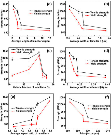 Variations in strength and microstructural features. (a) Average length, (b) average width, and (c) volume fraction of lamellar α; (d) average width of retained β; (e) average aspect ratio of lamellar α; (f) prior-β size.