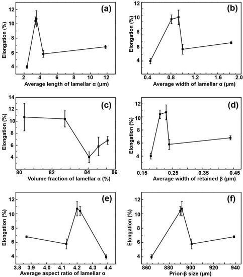 Variations in elongation and microstructural features. (a) Average length, (b) average width, and (c) volume fraction of lamellar α; (d) average width of retained β; (e) average aspect ratio of lamellar α; and (f) prior-β size.