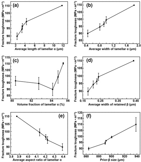 Variations in fracture toughness and microstructural features. (a) Average length, (b) average width, and (c) volume fraction of lamellar α; (d) average width of retained β; (e) average aspect ratio of lamellar α; and (f) prior-β size.