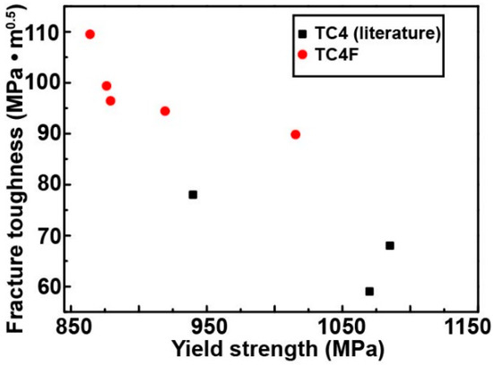 Figure 17 compares the combinations of yield strength/fracture toughness of the heat-treated samples in this work with BASCA heat-treated TC4 [24]. The fracture toughness of TC4F was superior to that of TC4. The fracture toughness of BASCA heat-treated TC4 was below 80 MPa·m1/2, while the fracture toughness of TC4F could reach 110 MPa·m1/2. This further demonstrates that fracture toughness was improved in TC4F through the addition of Fe. Thus, the TC4F shows promise in marine and aeronautical applications.