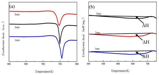 Differential scanning calorimetry (DSC) curves of the Cu45Zr48Al4Nb3 BMGC samples with different diameters, (a) in the temperature range of 600–800 K, (b) is the magnified view of (a).
