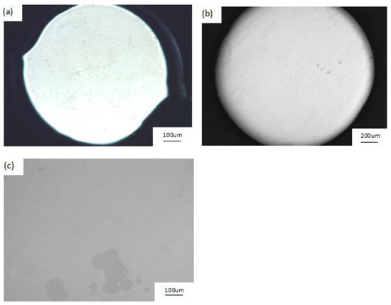 Figure 3 shows the OM images of the cross-sectional microstructures of the Cu45Zr48Al4Nb3 BMGC samples with different diameters. The 1 mm sample exhibited an almost glassy microstructure with few crystalline phases. The 2 and 3 mm samples exhibited a few spherical grains with different sizes. This indicates that the samples showed different microstructures during the rapid solidification process. The content of crystalline phase was roughly estimated by DSC. However, in order to precisely describe this, further experiments are needed to confirm this [23,24].