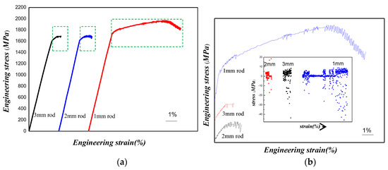 Compression stress–stain curves of the Cu45Zr48Al4Nb3 BMGC samples with different diameters (a), (b) is the magnified view of (a), and the value of the stress-drop is shown in the inset of Figure (b).