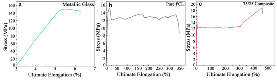 Generally, metallic glasses are brittle in nature, but the present Mg-based metallic glass displayed some plastic deformation (Figure 1a) in addition to the expected elastic deformation [46]. This plastic behavior is linked to shear band formation and propagation occurring during the tensile test. Metallic glasses are prone to shear band formation at room temperature [47]. Shear bands are important in metallic glasses because they play a major role in the plasticity and failure at room temperature. The ductility of the Mg-based metallic glass was poor, and the shear bands occurred near the failure of the ribbon. The shear bands occurring along the plane close to the maximum shear stress and flow stress are due to local heating and disordering [48]. The short-range bond order usually increases with the heat of mixing of the constituent elements. This increase can cause a change in the atomic bond structure that affects local chemical inhomogeneity, which leads to the formation and propagation of shear bands [49,50]. For the case of pure PCL, lower tensile stress response was observed (15.2 ± 3 MPa), while the plastic deformation was found to be quite high because of its flexible nature (ultimate elongation of 352 ± 70%) (Figure 1b). The composite samples with a high percentage of PCL (75/25) showed a good ductility of more than 400%. In this regard, in the tensile tests, the (75/25) composite showed the best mechanical properties among the selected composites (Table 1).