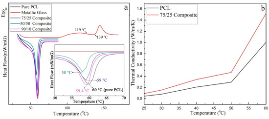 DSC thermographs for (a) Mg66Zn30Ca4 metallic glass, pure PCL, and different metallic glass/PCL composites; (b) thermal conductivity of the pure PCL and 75/25 composite samples. The melting points of the pure PCL and composites samples under higher magnification in the insert.