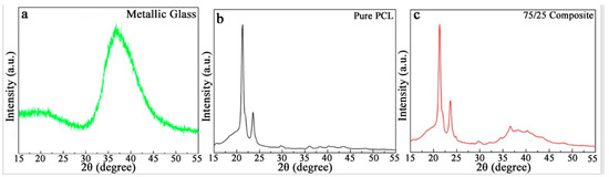 The XRD pattern of the Mg66Zn30Ca4 ribbon obtained by melt spinning shows that the material was amorphous. A broad scattering signal was found at 2θ = 38° for the metallic glass ribbon (Figure 3a). The XRD investigation of the pure PCL samples revealed a semicrystalline structure with two sharp peaks at 2θ = 21.5°and 23.5° (Figure 3b). This finding is consistent with earlier works [30,31] and normal for this polymer. The semicrystallinity in the 75/25 composite stems from the PCL content (Figure 3c), i.e., the semicrystalline structure in the XRD pattern results from the polymer structure. However, it should be also noted that the production procedure proceeding in the supercooled liquid zone may induce nano-crystallization of the metallic glass sample, but is hard to detect [44].