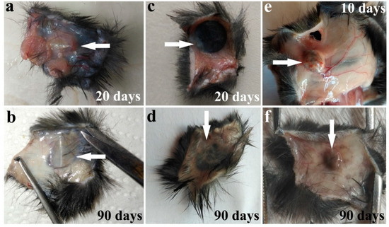 Photos of the implantation zones (marked by arrows) of a PCL (a,b) 75/25 composite (c,d) and metallic glass sample (e,f). PCL sample (a,b) and 75/25 composite sample (c,d) stayed in the implantation zone, maintained its shape and size, and did not cause inflammation; pure glass sample (e,f) caused the abscess in the implantation zone and was resorbed.