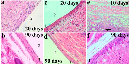 Micrographs of the implantation zone of the PCL (a,b), 75/25 composite (c,d), and metallic glass sample (e,f). (a) The smooth line of connective tissue (1) between the implantation zone (2) and tissues of the organism; no signs of inflammation and destruction of the tissues; hematoxylin and eosin staining; and magnification of 400×. (b) The smooth line of connective tissue (1) between the zone of implantation (2) and tissues of the organism; no signs of inflammation and destruction of the tissues; hematoxylin and eosin staining; and magnification of 400×. (c) The smooth line of connective tissue (1) between the implantation zone (2) and tissues of the organism; no signs of inflammation and destruction of the tissues; hematoxylin and eosin staining; and magnification of 400×. (d) The smooth line of connective tissue (1) between the implantation zone (2) and tissues of the organism; no signs of inflammation and destruction of the tissues; hematoxylin and eosin staining; and magnification of 400×. (e) Inflammation, neutrophil, and macrophages cell infiltration in the implantation zone and gas bubbles (marked by an arrow); the sample underwent bio-destruction; hematoxylin and eosin staining; and magnification of 100×. (f) Inflammation, connective tissue (1) surrounds the implantation zone filled with macrophages and cell detritus (2); the sample underwent bio-destruction; hematoxylin and eosin staining; and magnification of 400×.
