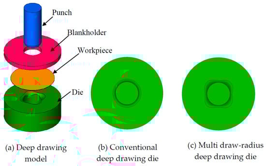 Schematic of deep drawing model and types of deep drawing die: (a) Deep drawing model; (b) Conventional die; (c) Multi draw-radius die.
