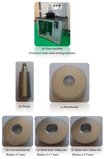 Press machine and set of punch and die: (a) Press machine (Universal sheet metal testing machine); (b) Punch; (c) Blankholder; (d) Conventional die (radius 3.5 mm); (e) Multi draw-radius die (radius 3.5–7mm); (f) Multi draw-radius die (radius 3.5–9mm).