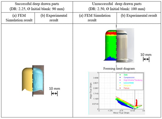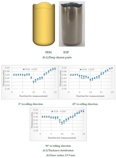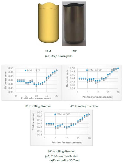 To validate the accuracy of the MDR die application obtained by FEM simulation, the FEM simulation results were compared with those obtained by experimental results, as shown in Figure 13. The FEM simulation results showed that the predicted deep drawn parts corresponded well with the experiments as shown in Figure 13a-1,b-1 in the cases of MDR draw radius of 3.5–7 and 3.5–9 mm, respectively. In terms of cup wall thickness, the FEM simulation results showed that the predicted cup wall thickness corresponded well with the experiments as shown in Figure 13a-2,b-2 in the cases of MDR draw radius of 3.5–7 and 3.5–9 mm, in which the errors in the analyzed cup wall thickness were approximately 3% compared with the experimental results.