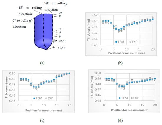 Cup wall thickness distribution between FEM simulation and experimental results: (a) Position for measurement; (b) 0° to rolling direction; (c) 45° to rolling direction; (d) 90° to rolling direction.