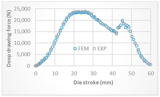 Comparison of deep drawing force between FEM simulation and experimental results (DR: 2.25; Ø initial blank: 90 mm).