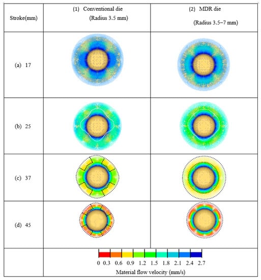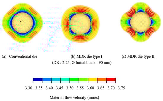 The principle of MDR die application, as aforementioned, was clearly characterized based on the material flow obtained by FEM simulation. As shown in Figure 8, the comparison of material flow between conventional and MDR die applications was illustrated. For the deep drawing stroke of approximately 17 mm, the material flow showed that the same manner in both cases of conventional and MDR die applications could be observed as shown in Figure 8a. These results corresponded well with deep drawing theory []. For the deep drawing stroke of approximately 25 mm, in the case of conventional die application as shown in Figure 8b-1, the effects of the anisotropy property of the material on material flow were clearly illustrated. The non-axisymmetric material flow on flange was clearly illustrated as depicted by dashed lines. These results corresponded well with deep drawing theory []. By contrast, in the case of MDR die application as shown in Figure 8b-2, the effects of the anisotropy property on material flow were compensated by multi draw radius especially on the large draw radius zone. However, owing to that there were large radius zones formed on MDR die, it was observed that the material flow velocity in the case of MDR die application was larger than that in the case of conventional die application especially on the large radius zone of MDR die. Moreover, the reduction of the non-axisymmetric material flow characteristic on flange could be obtained and clearly illustrated as depicted by dashed lines. Next, the deep drawing stroke was increased to approximately 37 mm, as shown in Figure 8c, and the effects of the anisotropy property of the material on material flow were clearly evidenced in the case of conventional die application as shown in Figure 8c-1. It was clearly observed that the non-axisymmetric material flow on flange was clearly illustrated as depicted by dashed lines. The flange shape was not a circular but had become square. By contrast, in the case of MDR die application as shown in Figure 8c-2, the effects of the anisotropy property of the material on material flow were continuously compensated by multi draw radius. The reduction of the non-axisymmetric material flow characteristic on flange and the asymmetry of the flange were clearly illustrated. The flange was in a more circular shape. Finally, in the case of conventional die application, the effects of the anisotropy property of the material on material flow were stronger as the deep drawing stroke increased as shown in Figure 8d-1. Vice versa, in the case of MDR die application, the effects of the anisotropy property of the material on material flow were continuously compensated by multi draw radius. The reduction of the non-axisymmetric material flow characteristic on flange were clearly illustrated as well as that the asymmetry of the flange could be continuously reduced and the flange was more circular in shape as shown in Figure 8d-2. These results revealed that by using MDR die application, the effects of the anisotropy property of the material on material flow could be compensated during the deep drawing process. The non-axisymmetric material flow characteristic on the flange and the asymmetry of the flange could be reduced during the deep drawing process. This resulted in preventing cup wall stretching and fracture as well as that the LDR could be increased.