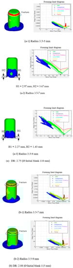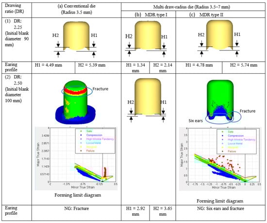 As mentioned in the previous section, the results illustrated that the effects of the anisotropy property of the material on material flow were related to the draw radius. Therefore, the MDR die should be strictly designed by relating to the anisotropy property of the material in each direction along the plane, at 45°, and at 90° to the rolling direction. Figure 9b,c show the deep drawn parts obtained by MDR die application related to the anisotropy property of the material. Figure 9b shows the MDR die application by designing the larger draw radius positioned for at 45° to the rolling direction and the small draw radius positioned for along the plane and at 90° to the rolling (named MDR type I). By contrast, Figure 9c shows the MDR die application by designing the larger draw radius positioned for along the plane and at 90° to the rolling direction and the small draw radius positioned for at 45° to the rolling (named MDR type II). The results showed that, in the case of LDR 2.25 (initial blank diameter of 90 mm), the deep drawn parts could be formed by conventional die application as shown in Figure 9a-1. This result corresponded well with the deep drawing theory and literature that by using conventional die application, the deep drawn part could be formed with LDR []. The results also showed that the deep drawn parts could be formed by using MDR die application in both cases of MDR die designs as shown in Figure 9b-1,c-1. However, it was observed that in terms of earing defect, the MDR type II showed a larger earing defect than that of MDR type I as well as than that of conventional die application. In addition, it was also observed that the earing defect obtained by using MDR type I was smaller than that of conventional die application. As these results show, to deep draw with LDR, the deep drawn parts could be achieved by using MDR die application. In addition, the quality of deep drawn parts obtained by MDR type I in terms of earing defects was better than that obtained by conventional die. The results illustrate that the MDR die design should be strictly considered as related to the anisotropy property of the material in each direction along the plane, at 45°, and at 90° to the rolling direction. Next, to deep draw over LDR, the result showed that by using conventional die application, the deep drawn part could not be achieved, and a fracture was generated as shown in Figure 9a-2. Based on the FLD, the FEM simulation result clearly showed that the fracture characteristic is formed as a circumferential character. This result agreed well with deep drawing theory []. By contrast, in using the MDR die application, the results illustrated that the deep drawn part could be achieved by MDR die type I application as shown in Figure 9b-2. However, using MDR die type II, the deep drawn part could not be achieved. The six ears were also characterized on the basis of FLD, and a fracture was also generated on the top of the deep drawn part as shown in Figure 9c-2. Owing to the anisotropy property of the material in each direction along the plane, at 45°, and at 90° to the rolling direction related to the formability [], therefore, the design of the larger draw radius positioned at 45° to the rolling direction and the smaller draw radius positioned along the plane and at 90° to the rolling direction was suggested. As shown in Figure 10, the MDR die type II resulted in that the larger non-axisymmetric material flow on flange was formed compared with those in the cases of conventional and MDR die type I applications. As these material flow analyses show, as aforementioned, the non-axisymmetric material flow characteristic on flange and the asymmetry of the flange could be increased and cup wall stretching and fracture were then easier to generate.