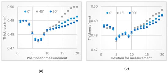 Figure 11 shows the obtained deep drawn parts with respect to various MDR dies and drawing ratios. The drawing ratios of 2.75 and 2.88 which were larger than LDR were investigated, as respectively shown in Figure 11a,b. On the basis of deep drawing theory [], the draw radius of 3.5 mm was recommended and then it was set as a small draw radius in MDR die. Next, the large draw radius values of 5, 7, and 9 mm were set as the large draw radius. With the drawing ratio of 2.75 as shown in Figure 11a, the results showed that the deep drawn parts could not be achieved when the large radius of 5 mm was set, as shown in Figure 11a-1. This result could be explained by the draw radius of 5 mm, set as the large radius, was too small to reduce the non-axisymmetric material flow characteristic during the deep drawing process. Conversely, as the large radius was increased, the greater reduction of non-axisymmetric material flow characteristic could be achieved, and then the deep drawn parts could be achieved as for the large radius values set as 7 and 9 mm, as shown in Figure 11a-2,a-3, respectively. The increases in large radius resulted in that, as aforementioned, the non-axisymmetric material flow characteristic on the flange was reduced, and the asymmetry of flange could also be reduced. This resulted in the more circular flange shape. However, it was also observed that owing to the large radius of 9 mm, the non-axisymmetric material flow characteristic on the flange could be reduced, getting a more circular flange shape than that for the large radius of 7 mm during the deep drawing process. The earing defect in the case of large radius 9 mm was smaller than that obtained in the case of the large radius of 7 mm. Next, with the drawing ratio of 2.88 as shown in Figure 11b, the results showed that the deep drawn parts could not be achieved. Namely, owing to the overly large drawing ratio (overly large initial blank diameter) applied, the non-axisymmetric material flow on the flange could not be effectively reduced during a whole deep drawing process. These results revealed that in the present research, the LDR could be increased by approximately 22.22% using MDR die application. In addition to the increases in LDR, the quality of deep drawn parts in terms of cup wall thickness and earing defects were also increased. Specifically, the earing defect could be reduced approximately 40% compared with the use of conventional die as shown in Figure 9 and Figure 11. Next, the more uniform cup wall thickness in each direction along the plane, at 45°, and at 90° to the rolling direction could be obtained by comparing with the use of conventional die as shown in Figure 12. However, the MDR die should be strictly design related to the anisotropy property of the material in each direction along the plane, at 45°, and at 90° to the rolling direction which was suggested in the previous section.