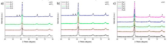The results of the microstructure investigation of the as-cast samples using the XRD method are shown in Figure 1. According to the obtained X-ray diffraction patterns, it can be concluded that the structure of the samples mainly consists of the NiTi phase. The sample mostly consists of the crystalline phase of NiTi cP2. In addition, an amorphous phase is also present in the structure, the presence of which is confirmed by a diffuse broad peak in the range 2θ 37–46°. For Al and Cr, the maximum allowable concentration is 5 at%, and for Fe it is 8 at%. With an increase in the content of the additional alloying element, the tendency to precipitate the NiTi2 phase is well documented. This is due to the chemical affinity of Fe and Ni. Because of this, the Fe atoms can easily occupy the Ni atoms’ positions and not cause the precipitation of intermetallic phases.