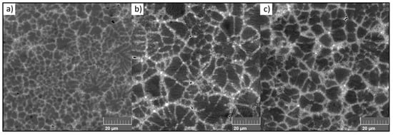 SEM images of as-cast samples (BSE mode): (a) alloy Al-1, (b) alloy Cr-1, (c) alloy Fe-1.