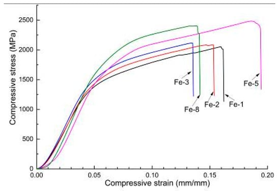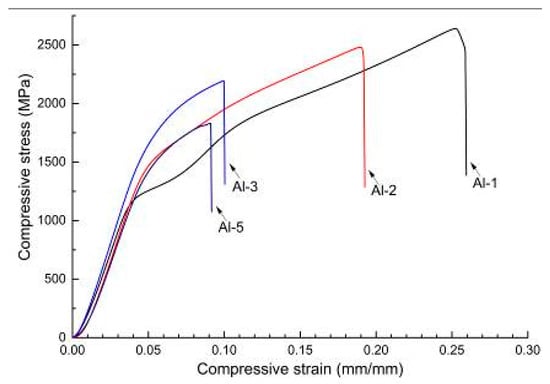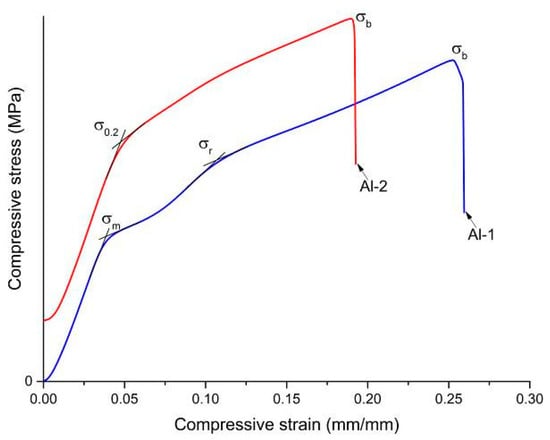 In most of the studied alloys, the additional alloying elements led to the suppression of martensitic transformation, which was observed in [,,]. The only exception is alloy Al-1. The deformation curves for alloys with and without martensitic transformation are shown in Figure 4. The compression curve of alloy Al-1 consists of three stages. The first stage is elastic deformation, the second is superelasticity caused by martensitic transformation, and the third is plastic deformation. For other alloys, the deformation curve consists of two stages: elastic and plastic deformation.