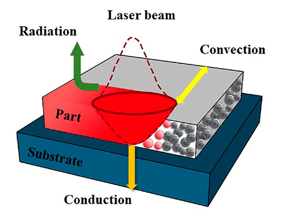 The beginning of the molding process is to scrape the powder from the powder cylinder into the molding cylinder (GUANGDONG HANBANG3D TECHNOLOGY CO., LTD, Zhongshan City, China). After that, the laser starts scanning the contour of the workpiece and moves according to the scanning path. Figure 1 describes the typical thermophysical behavior in the SLM procedure. As the laser reaches upper surface of the powder, some absorbed energy melts the powder to form a miniature size pool, and the remaining energy is lost in the form of thermal convection and radiation. With the occurrence of powder melting, cooling and solidification, metallurgical bonding is formed between adjacent scanning regions.